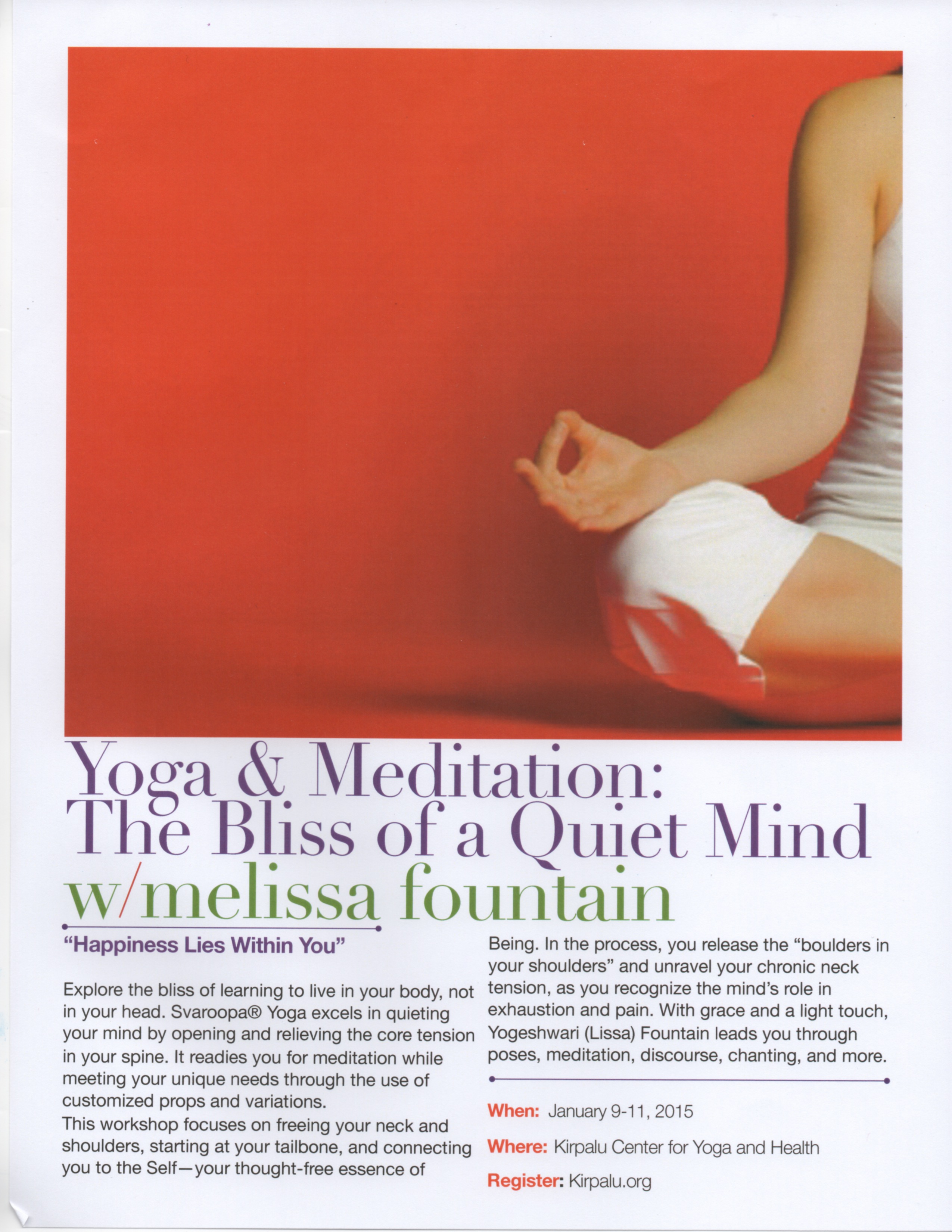 Complete the Holidays with a Svaroopa® Yoga Weekend Retreat at Kripalu Center for Yoga and Health December 15, 2014 by Central Street Yoga & Meditation Note correction to spelling of web address: Kripalu.org